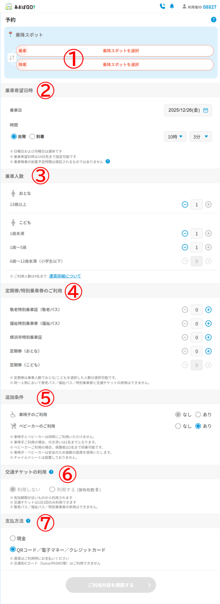 3)乗車予約項目 乗車日時、人数、ベビーカーの利用有無や支払い方法の選択