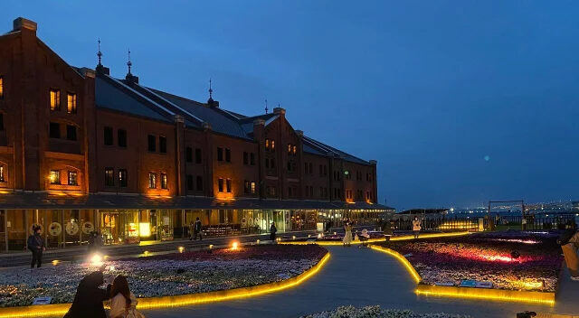 昼は、日の光に輝くカラフルな花々と、木製の遊具を使用したお子様も遊べるプレイエリアが際立ち、春の明るい雰囲気に包まれます。夜は、花畑や横浜赤レンガ倉庫がライトアップされ、幻想的で美しい景色が広がります。芝生で作られたベンチや大人も寝転べる丘があるため、リラックスしながら、昼と夜でそれぞれ異なる表情をお楽しみいただけます。