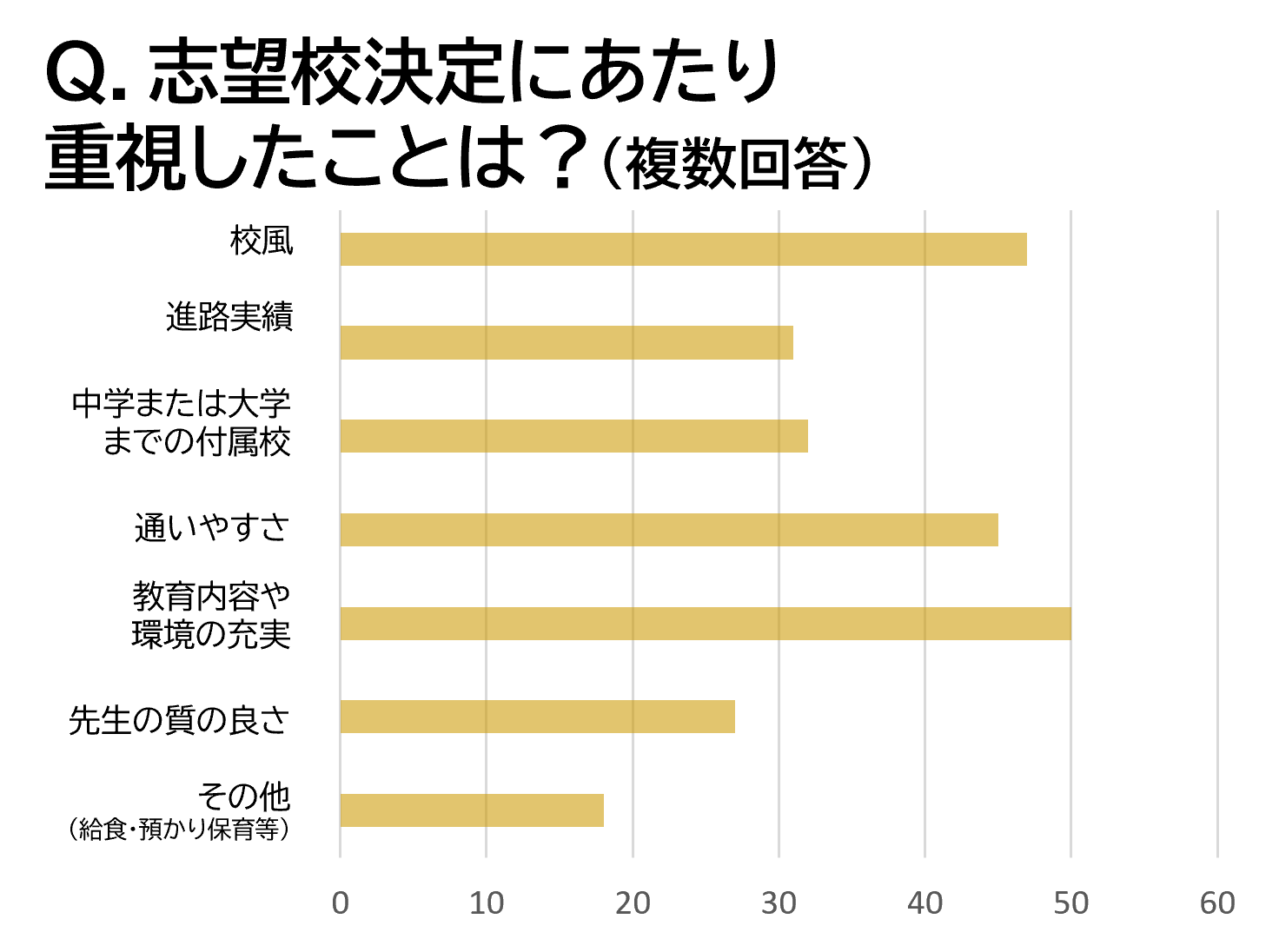 重視するのはやはり「教育内容や環境が充実している」こと。「校風」や「通いやすさ」も重要なポイントです。