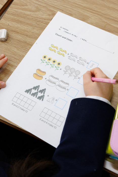 1年生を対象に、横山先生が算数で行った「CLIL」の授業。基本は英語ですすめられますが、ときには日本語でも説明を加え、算数と英語の両方が無理なくトータルで学べるように考えられています