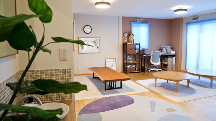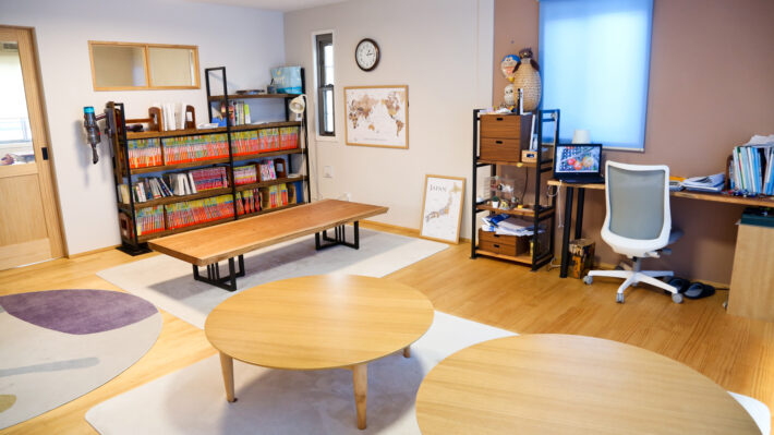 目に飛び込んでくるのは、やわらかく明るいフローリングと、ところどころに施された壁のアクセントカラー。これはスタッフでもある齋藤先生の息子さんがこだわって選んだ珪藻土で塗られたものです。四方にある窓から明るい光が差し込み、一枚板のローテーブルやかわいい丸テーブルが置かれ、「どこに座ろうかな?」と、つい自分好みの場所を探したくなります。
