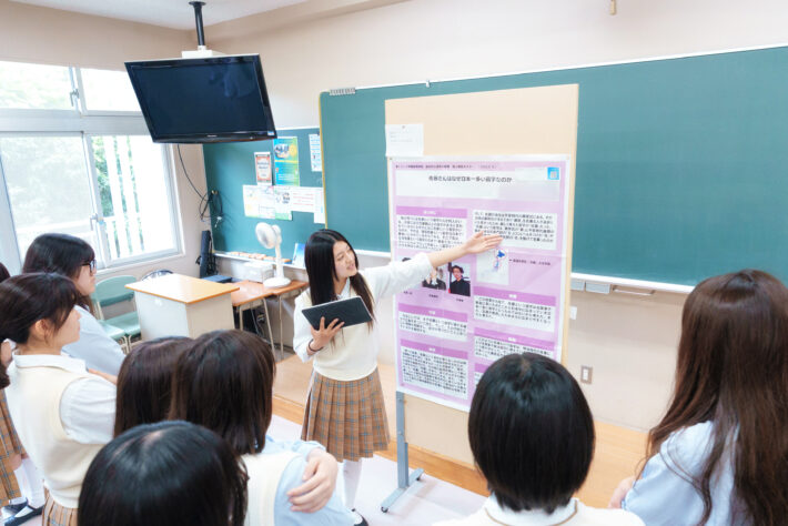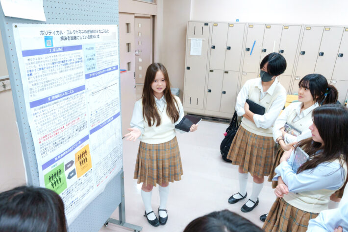 2024年度は睡眠、芸術、流行や「推し」などのゼミを設定。高校2年の2学期には、ゼミ内で「中間報告」として各々が作成したポスターを発表し、その後、ブラッシュアップした成果を、「ポスターセッション」という形で3学期に学年内で発表しました。