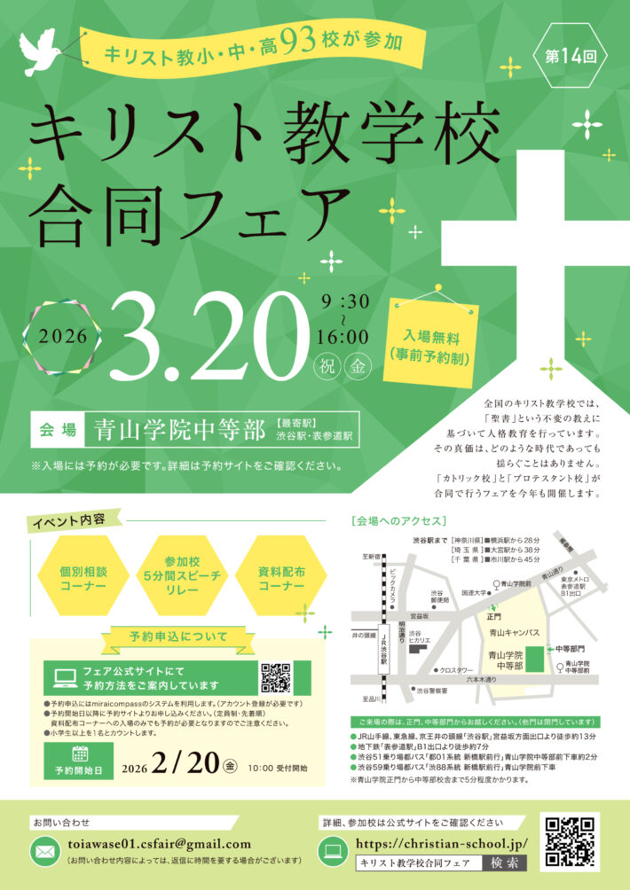 2026年3月20日、青山学院中等部(東京都渋谷区)にて、「キリスト教学校合同フェア」が開催されます。全国の小中高93校が参加予定!