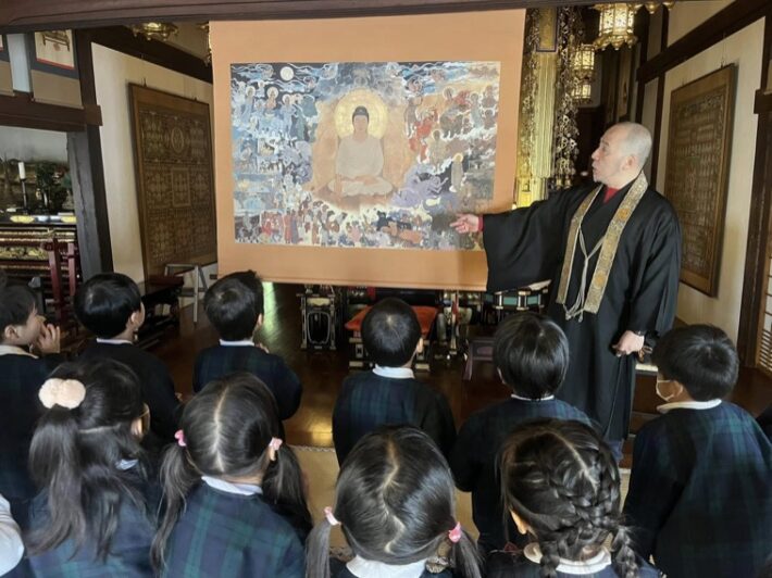 モットーは、みんなで子どもを育てる「子そだて園」。心身ともに健康で、自主性と創造性に富んだ豊かな人間性を育んでいます。お寺の幼稚園ならではの行事も多く、心に刻まれる数々の原体験が、やさしさや気品を養います。子どもたちの元気な声が響く活気にあふれる園内を訪ね、園長先生にお話をうかがいました。