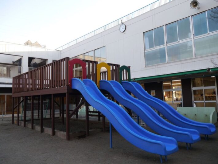 2025年、園庭に新設した遊具「すべりっち」。鎖を上ると3台の滑り台があり、お友だちと一緒に滑ることができると大好評。(城郷幼稚園)