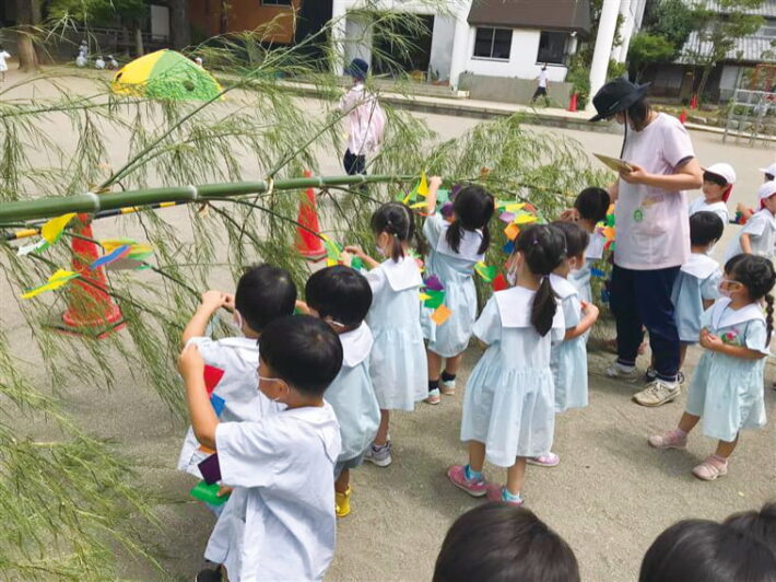 七夕、浴衣姿で盆踊りを楽しむ夕涼み会、おもちつき、節分会など、日本の伝統文化に触れる行事がたくさんあります。(城郷幼稚園)