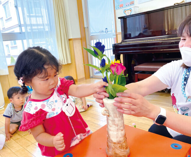 「花の日」は、おうちの人や警察官、お医者さんなど、みんなのために働く人へ感謝の気持ちを伝える行事です。子どもたちは「ありがとう」と言いながら花瓶に花をさします。