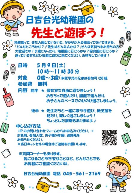 ・5/9(土)10:00~日吉台光幼稚園の先生と一緒にあそぼう!【日吉台光幼稚園】