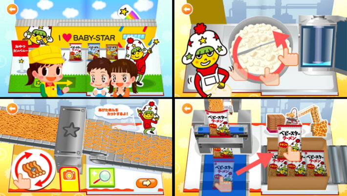 しかけ絵本をコンセプトにした、デジタル版の工場見学コンテンツ。「ベビースターラーメン」がどんな材料で・どんな製造工程で作られてお店に届くのかを学ぶことができます。製造工程の途中では 、機械を操作する仕掛けを楽しみながら学ぶことができます。