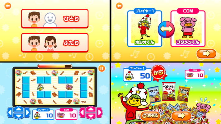 プレイヤー1が選んだキャラクターによって、ゲーム内に登場するおやつが「ベビースターラーメン」か「ブタメン」かに変わります。画面上に散りばめられた「麺のかけら」や「ベビースターラーメンのパッケージ」「ブタメンのパッケージ」などをキャラクターを操作して獲得すると、パリポリと麺を食べる効果音が鳴って点数としてカウントされます。