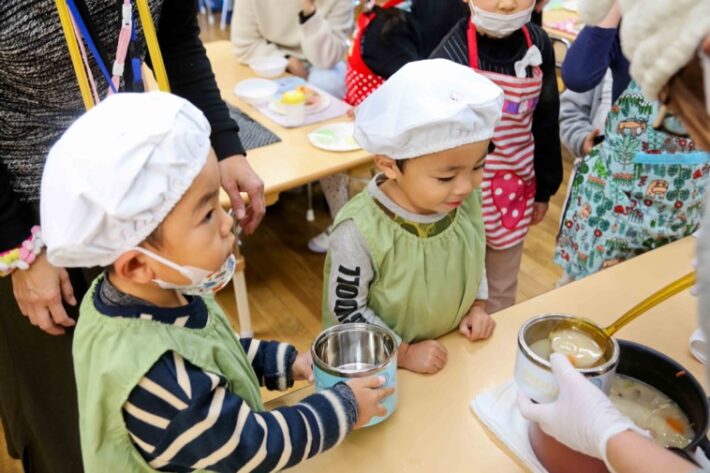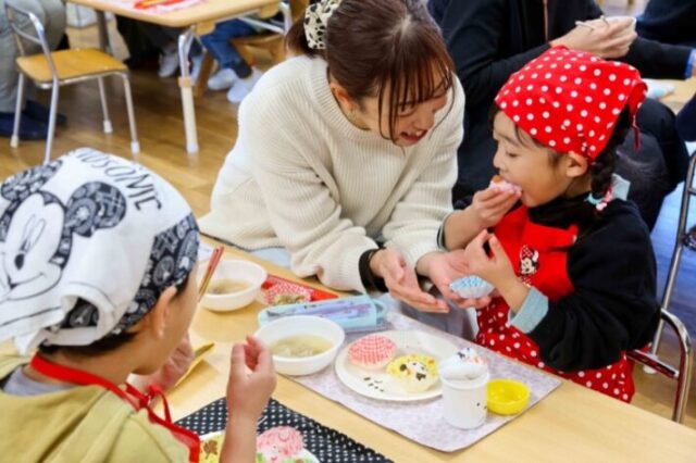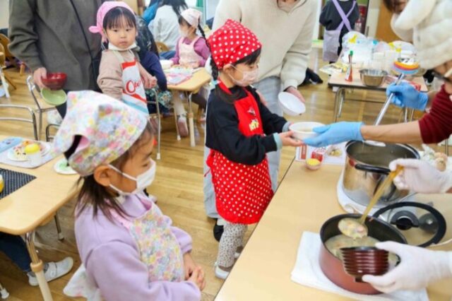 試食タイムは野菜たっぷりのあったかい豚汁と一緒に。栄養バランスもバッチリです。