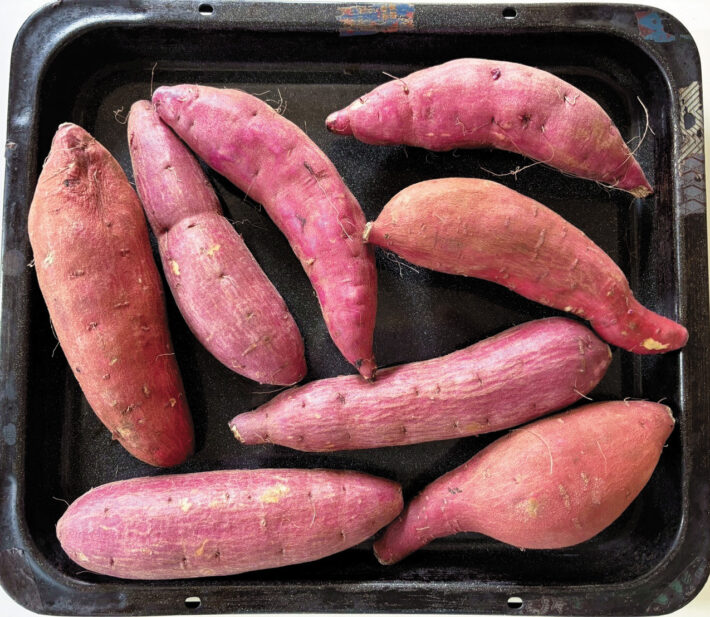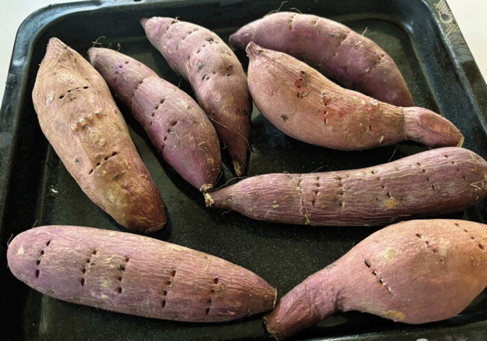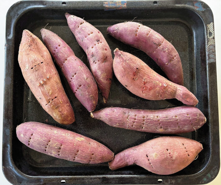 オーブンを150℃に予熱し、天板にさつまいもをならべて20分焼く。