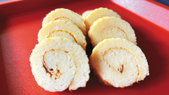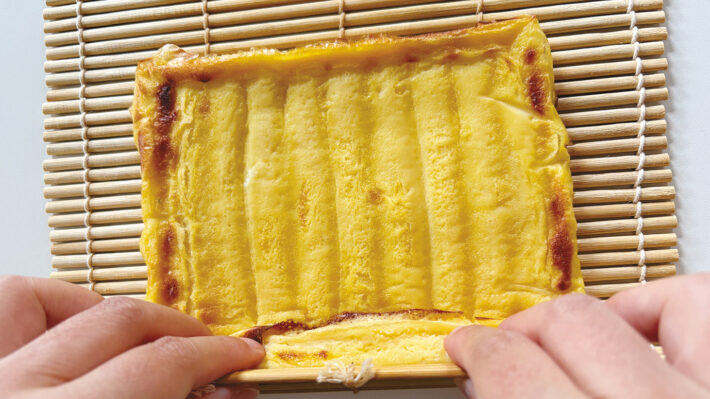熱いうちに「まきす」で卵焼きをくるくるまいてつくります。