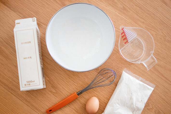 ①ボウルにホットケーキミックスをいれ、牛乳と油を加えてよく混ぜあわせる。1つにまとまり、粉っぽさがなくなってきたら、ボウルからだしてなめらかになるまでこねる。
