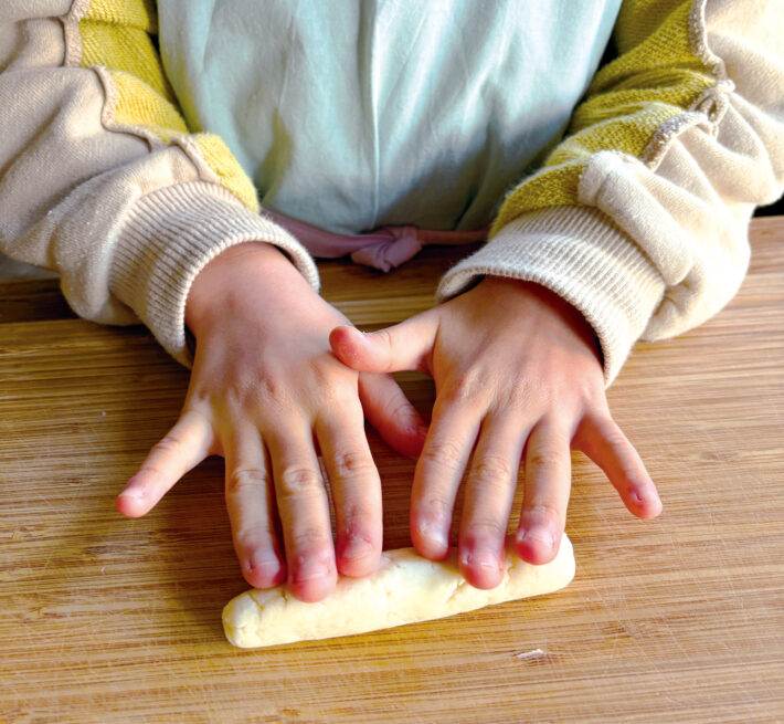 のばした生地のはしに具をおき、ころがしながら生地をゆっくりまきつける。すきまがあいてもだいじょうぶ!