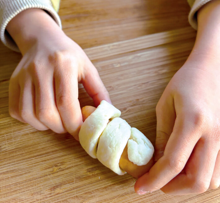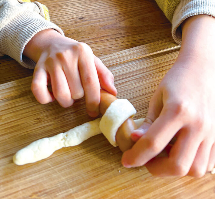 ほそくのばした生地で具をまきます。具はウインナーソーセージやスティックチーズのほか、ちくわや魚肉ソーセージなどもおすすめです。